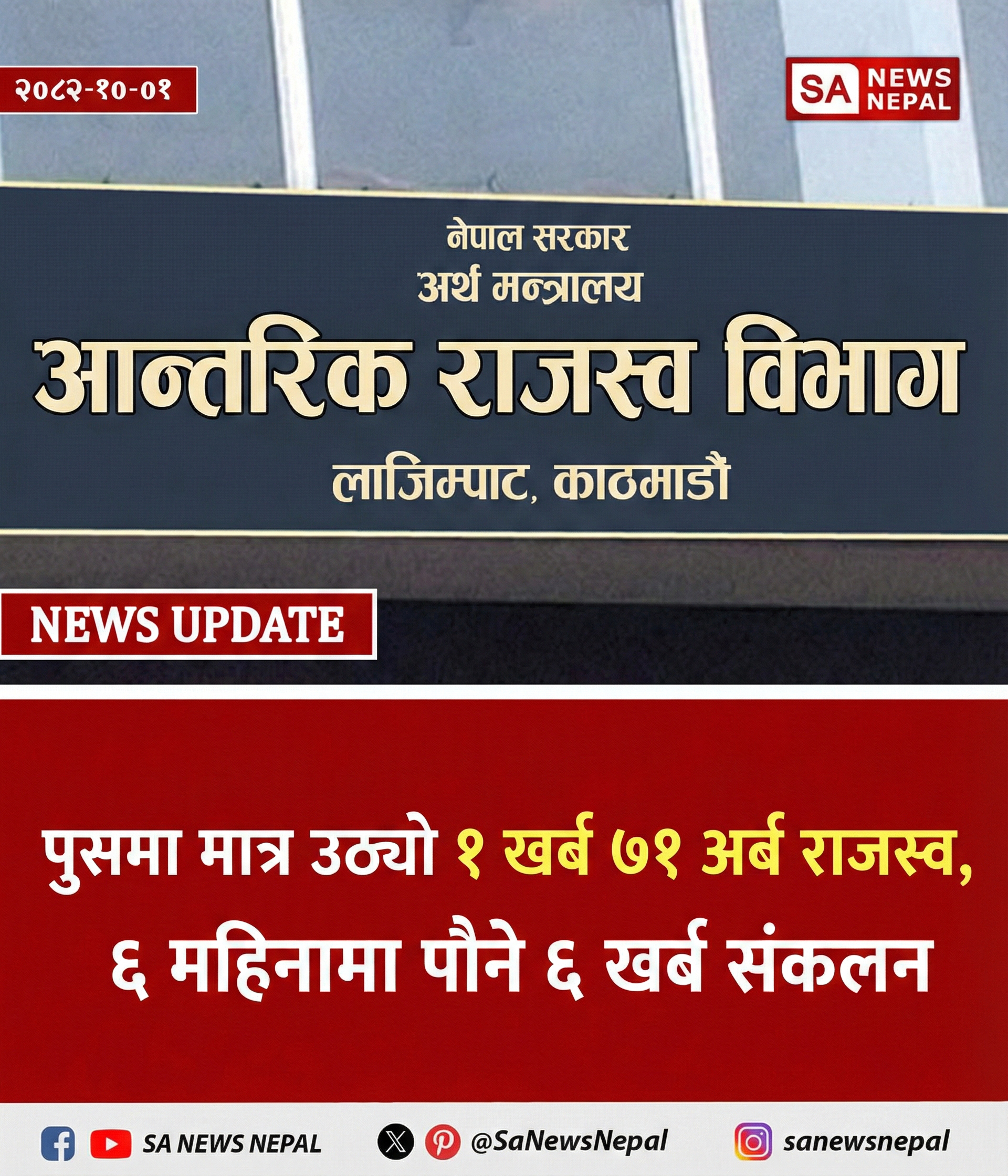 चालु आर्थिक वर्षको पहिलो ६ महिना (साउन–पुस)सम्म सरकारले ५ खर्ब ८१ अर्ब ४१ करोड रुपैयाँ राजस्व संकलन गरेको छ, जुन लक्ष्यको ८१.७५ प्रतिशत मात्र हो । यस अवधिमा ७ खर्ब…