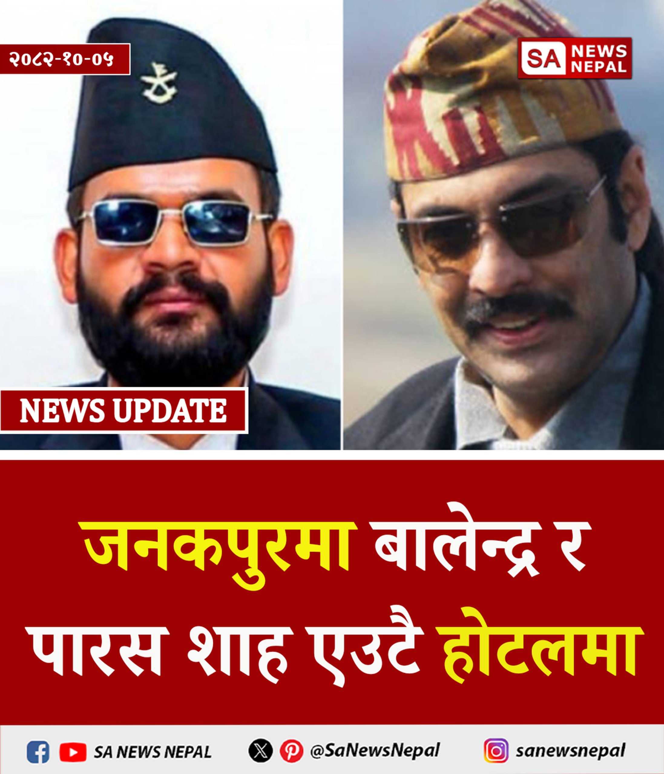 स्वतन्त्र पार्टी (रास्वपा) को जनकपुरमा हुने सभाका लागि आएका बालेन्द्र शाह र पूर्वयुवराज पारस शाह आइतबार एउटै होटलमा बसेका छन् । उनीहरू सोल्टी समूहले व्यवस्थापन गरिरहेको होटल यात्री निवासमा बसेका…