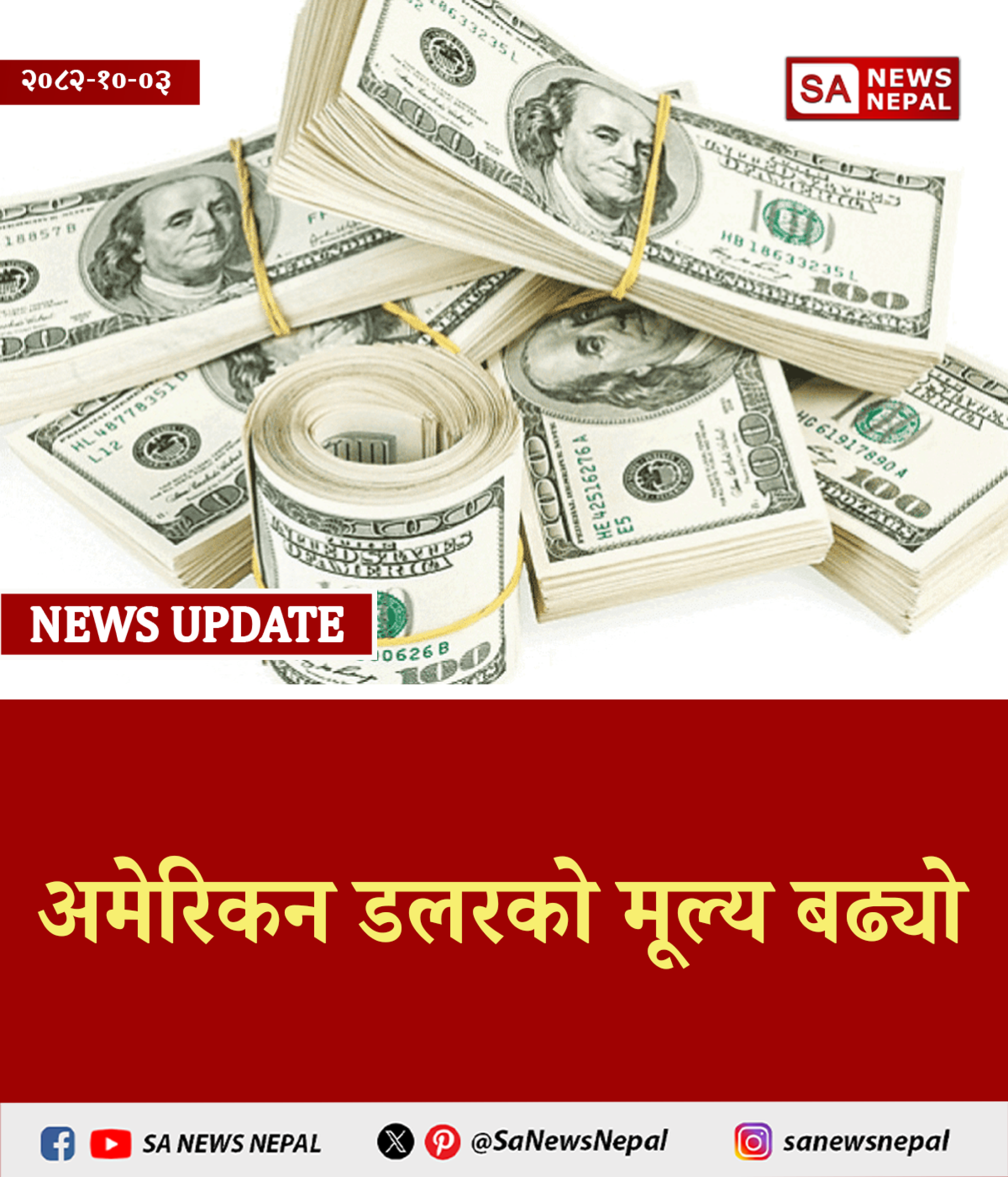 अमेरिकन डलरको मूल्य बढ्यो | SA News Nepal नेपाल राष्ट्र बैङ्कले आज (शनिबार) का लागि विदेशी मुद्राको विनिमयदर सार्वजनिक गरेको छ। सार्वजनिक दरअनुसार अमेरिकी डलर हालसम्मकै उच्च बिन्दुमा पुगेको छ।…