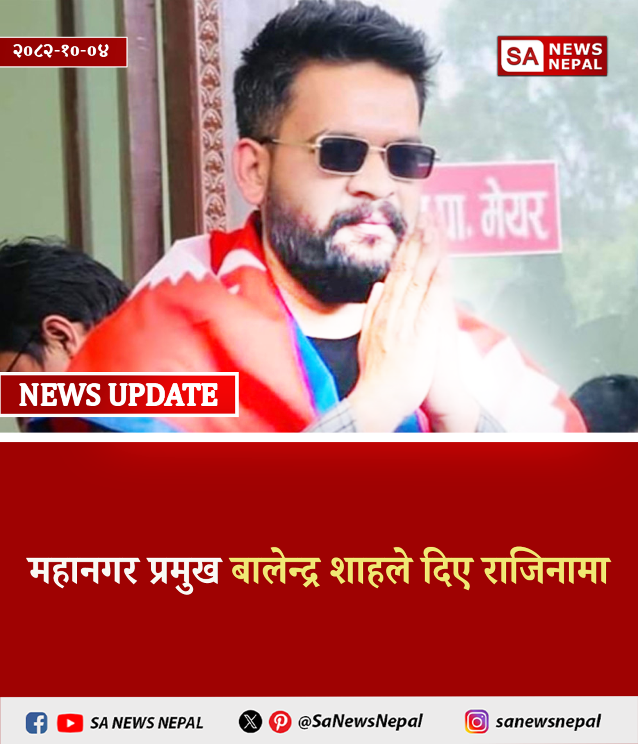 काठमाडौं महानगरपालिकाका मेयर बालेन्द्र शाहले महानगर प्रमुख पदबाट राजीनामा दिएका छन्। आइतबार उनले आफ्नो राजीनामा पत्र महानगर उपप्रमुख सुनिता डंगोलसमक्ष बुझाएका हुन्। राजीनामा दिएसँगै शाह रास्वपा पार्टी कार्यालय पुगेका छन्।…