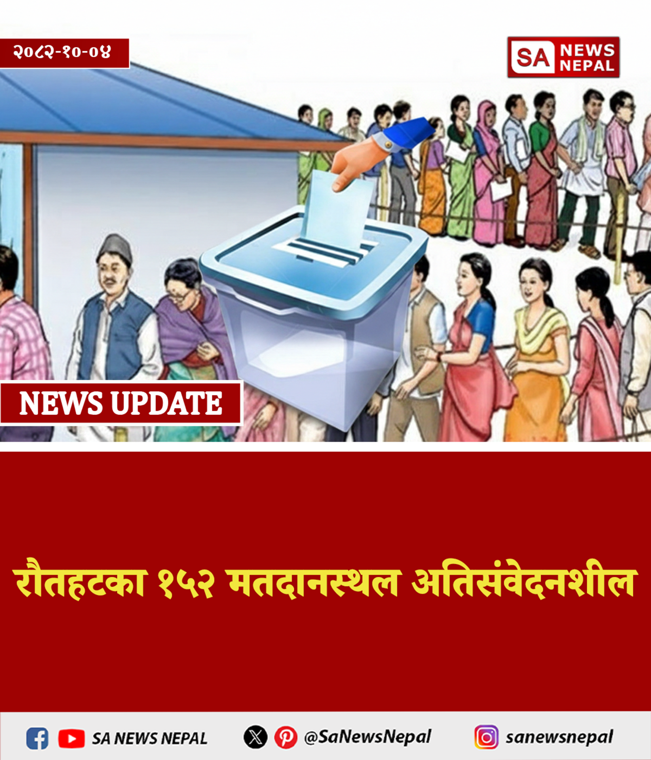 रौतहटमा फागुन २१ गते हुने प्रतिनिधिसभा निर्वाचनका लागि तोकिएका २७७ मतदानस्थलमध्ये १५२ मतदानस्थललाई अतिसंवेदनशील सूचीमा राखिएको छ। १०० मतदानस्थल संवेदनशील २५ मतदानस्थल सामान्य कुल मतदान केन्द्र: ५४१ कुल मतदाता: ४,३६,६११…