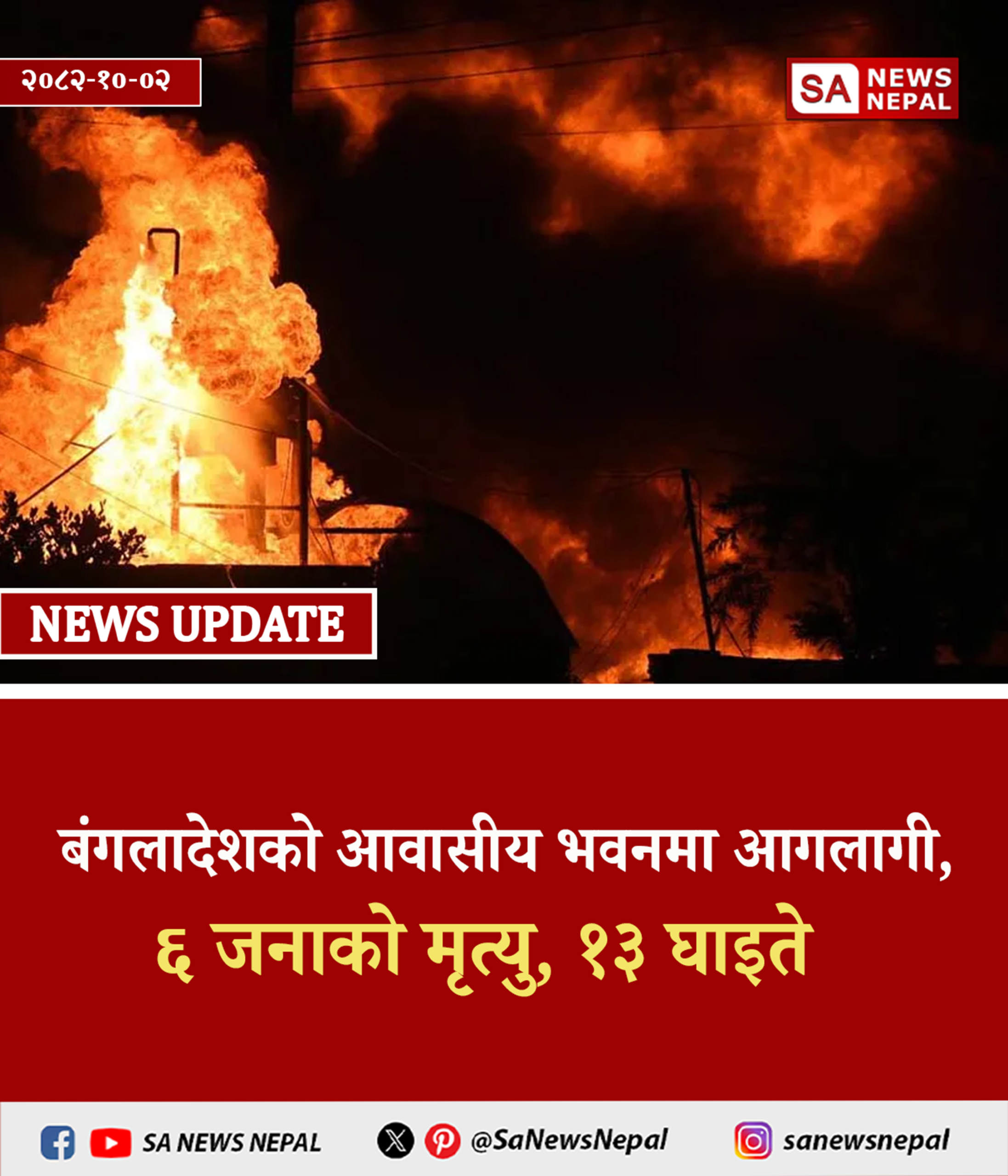 बंगलादेशको राजधानी ढाकाको एक आवासीय भवनमा शुक्रबार बिहान आगलागी हुँदा ६ जनाको मृत्यु भएको छ भने १३ जना…