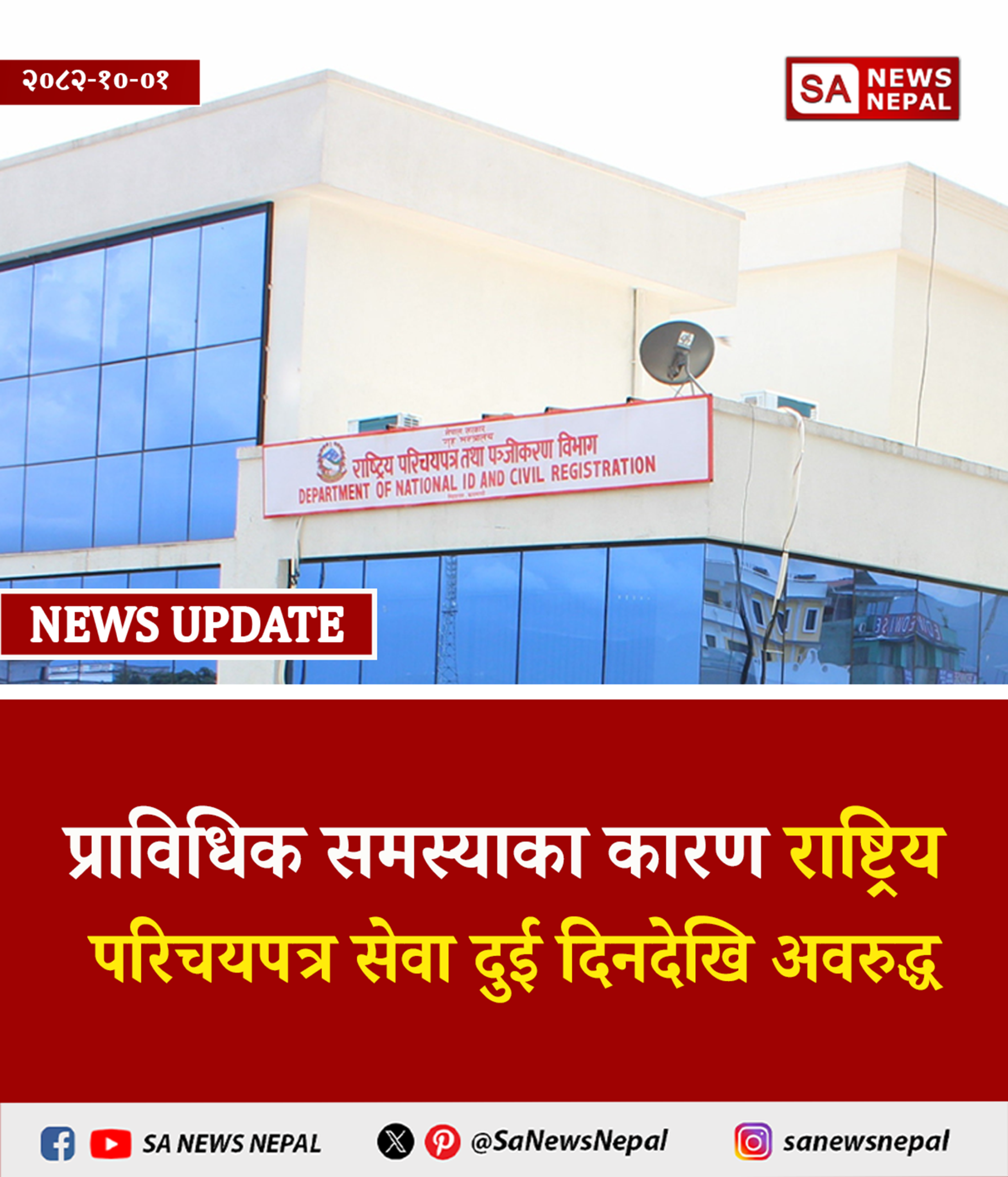 राष्ट्रिय परिचयपत्र तथा पञ्जीकरण विभागका अनुसार राष्ट्रिय परिचयपत्र व्यवस्थापन सूचना प्रणालीमा आएको प्राविधिक समस्याका कारण सेवा दुई दिनदेखि…